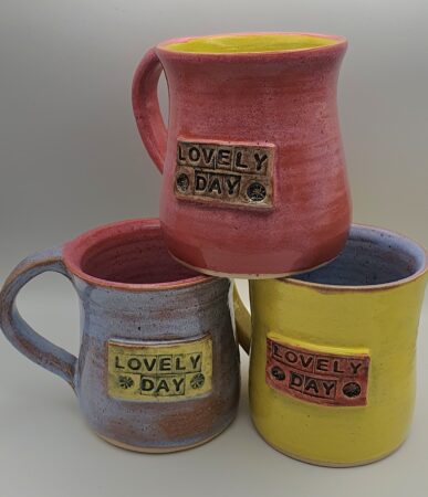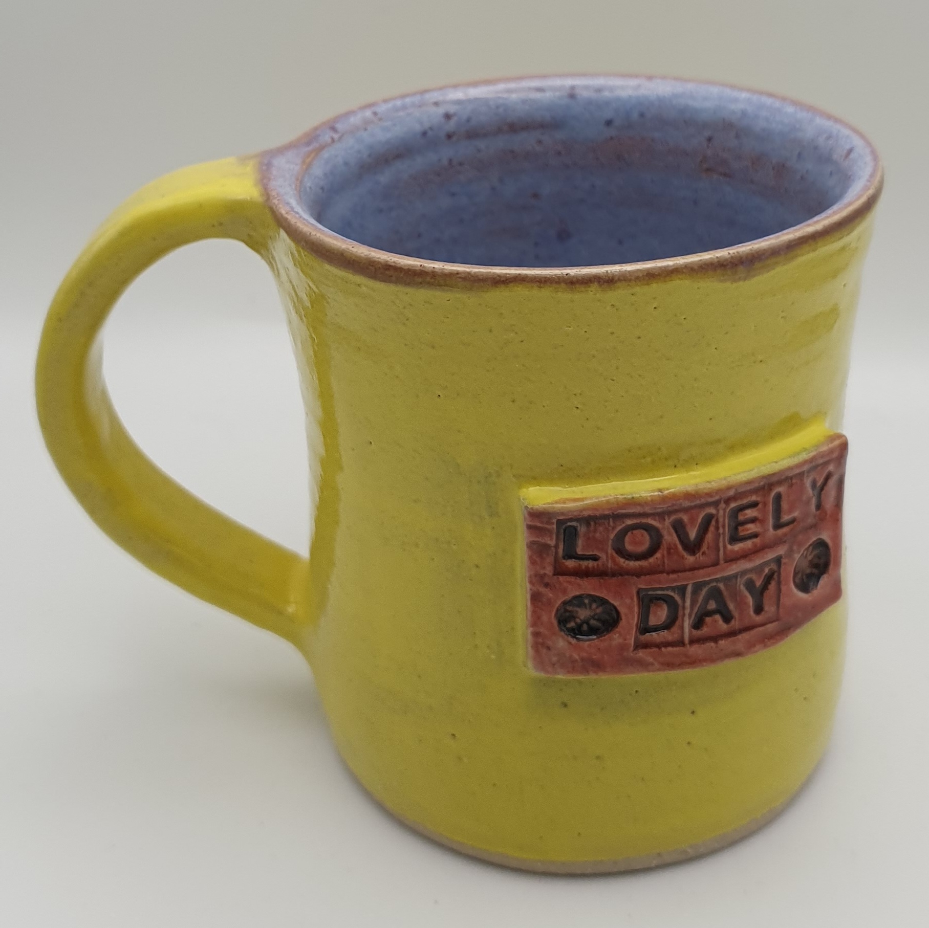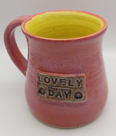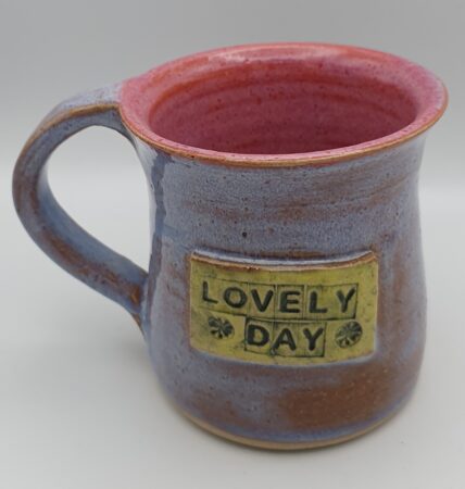 Mayco Glaze combinations of ‘Raspberry Mist’ , ‘Lavender Mist’ and ‘Yellow Gloss’ which I think work well for such a happy mug!