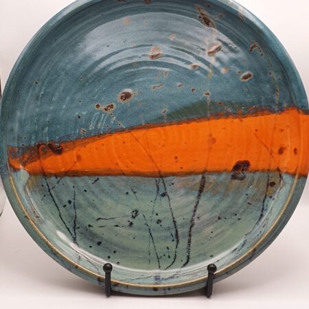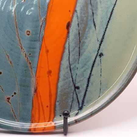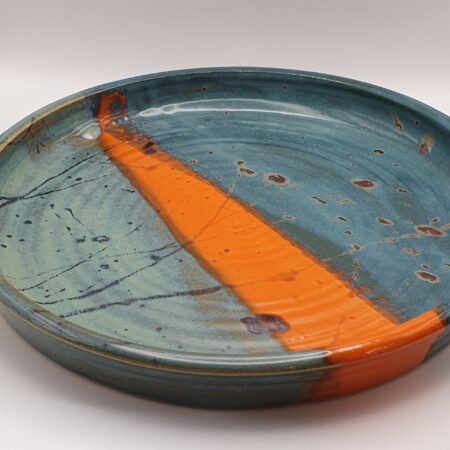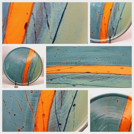 Glazed in Tourmaline, Textured Turquoise and Orange gloss with flecks/ splatters of Root Beer (brown)
